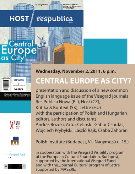 During the event there is going to be the presentation of the common English language issue of V4 journals: Host, Res Publica Nowa, Lettre, Kultura + Kontext titled as „Central Europe as City” and the authors will speak about the coming common English language journal Visegrad Insight with Wojciech Prybylski as editor in chief.